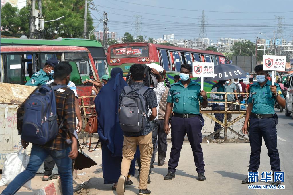 5月17日,警察在孟加拉國(guó)首都達(dá)卡的車站手舉佩戴口罩的提示牌,要求從各地返回達(dá)卡的人們注意防護(hù)安全。