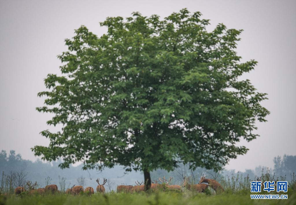 5月17日,一群麋鹿在石首麋鹿國家級(jí)自然保護(hù)區(qū)內(nèi)活動(dòng)。新華社記者 肖藝九 攝