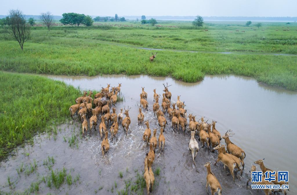 5月17日,一群麋鹿在石首麋鹿國家級自然保護(hù)區(qū)內(nèi)活動(無人機照片)。新華社記者 肖藝九 攝
