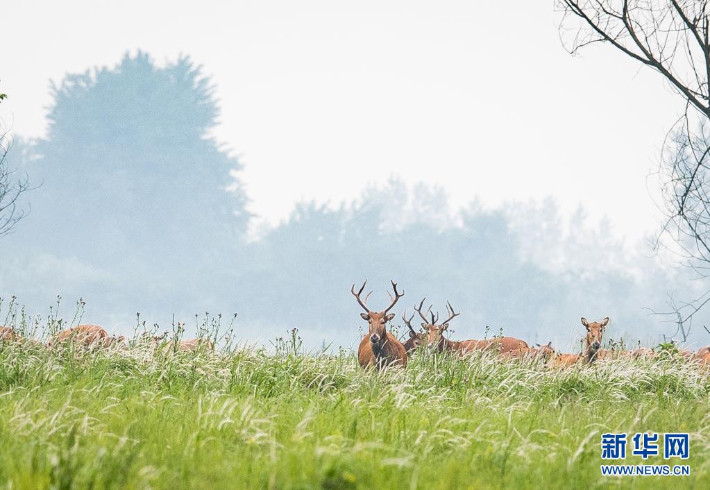 5月17日,一群麋鹿在石首麋鹿國家級自然保護區(qū)內活動。新華社記者 肖藝九 攝