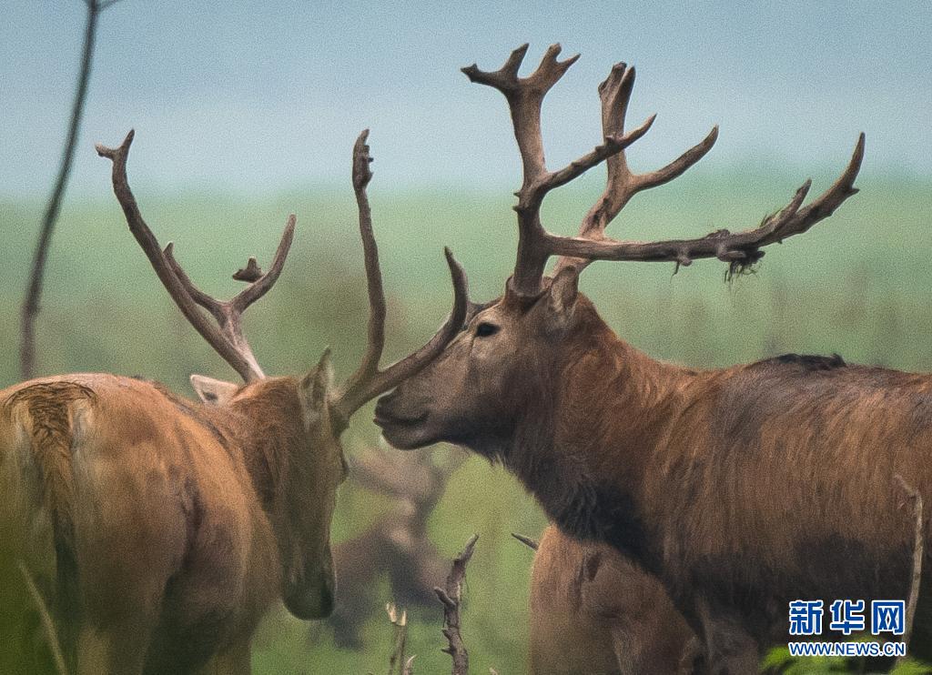 5月17日,麋鹿在石首麋鹿國家級自然保護區(qū)內活動。新華社記者 饒饒 攝