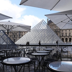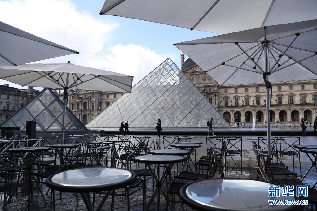 5月19日,法國巴黎盧浮宮博物館旁的餐館戶外區(qū)域準備迎客。