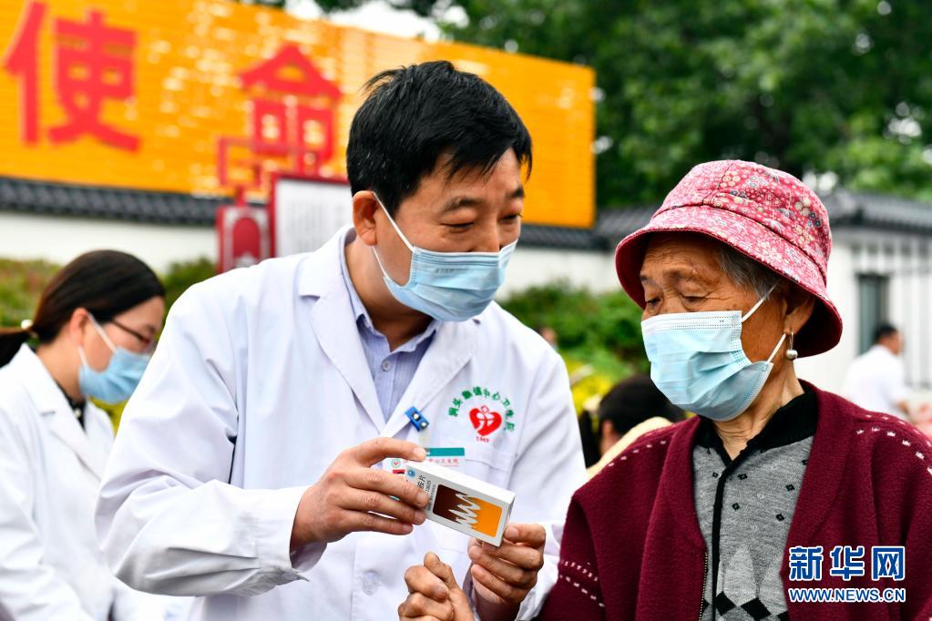 5月21日,在棗莊市臺兒莊區(qū)澗頭集鎮(zhèn)褚提樓村,“學黨史惠民”醫(yī)療小分隊為群眾開展送醫(yī)、送藥服務。