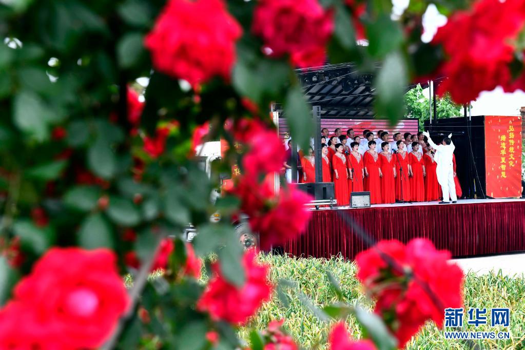 5月21日,在棗莊市臺兒莊區(qū)馬蘭屯鎮(zhèn)西張莊村,“學(xué)黨史惠民”文藝小分隊為群眾表演節(jié)目。