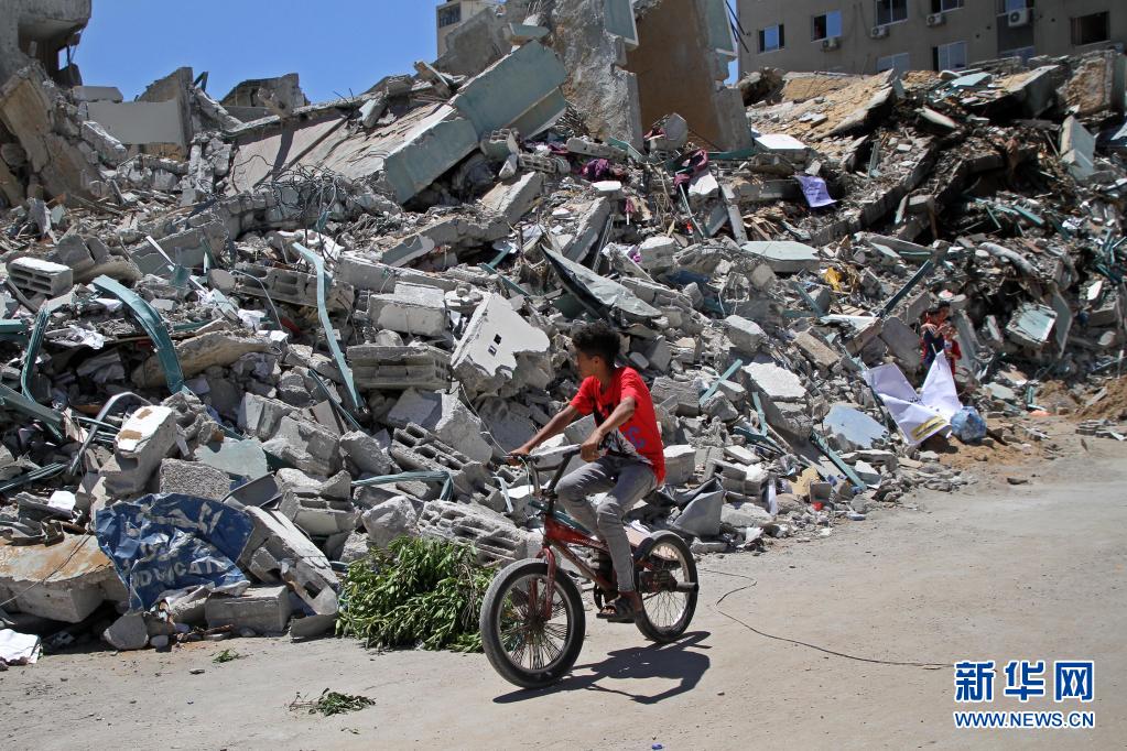 5月23日,一個男孩在加沙城騎車經(jīng)過遭以軍空襲損毀的賈拉塔。5月10日以來,以色列與加沙地帶武裝組織之間爆發(fā)嚴重沖突。20日晚,哈馬斯與以色列方面各自宣布,雙方已達成?;饏f(xié)議,?;饛?1日凌晨開始。新華社發(fā)(里澤克·阿卜杜勒·賈瓦德攝)