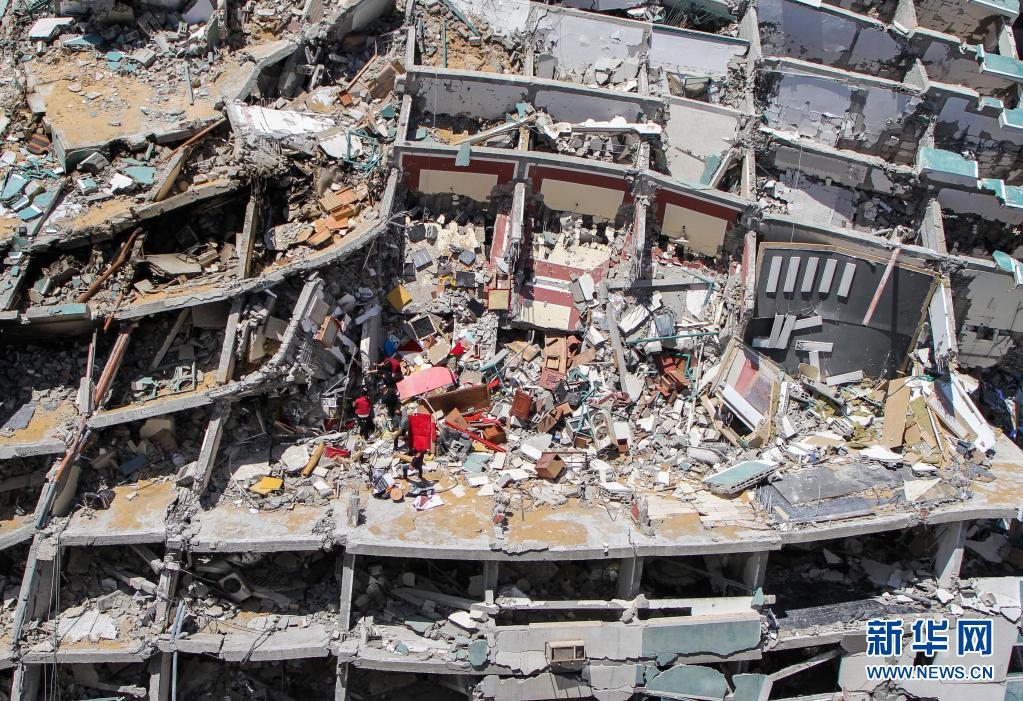 這是5月23日在加沙城拍攝的遭以軍空襲損毀的賈拉塔。5月10日以來(lái),以色列與加沙地帶武裝組織之間爆發(fā)嚴(yán)重沖突。20日晚,哈馬斯與以色列方面各自宣布,雙方已達(dá)成?;饏f(xié)議,?;饛?1日凌晨開(kāi)始。新華社發(fā)(里澤克·阿卜杜勒·賈瓦德攝)