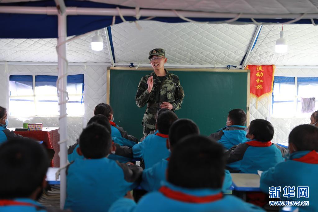 5月24日,武警青??傟牴逯ш牂C動大隊排長張國睿為花石峽鎮(zhèn)藏文中心寄宿制小學的孩子上課。新華社記者 劉芳 攝