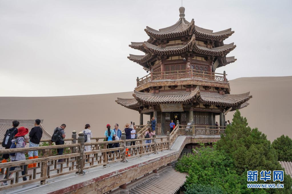5月30日,游客在月牙泉附近觀光。