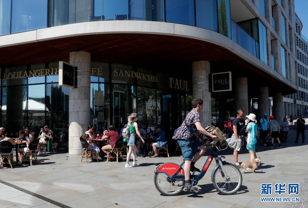 6月1日,人們?cè)谟鴤惗匾患铱Х葟d的戶外餐飲區(qū)就餐。