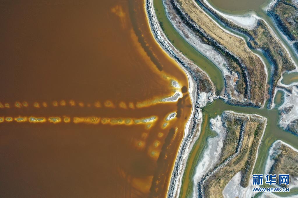 近日,隨著氣溫不斷升高,山西運(yùn)城鹽湖呈現(xiàn)五彩斑斕的景象。