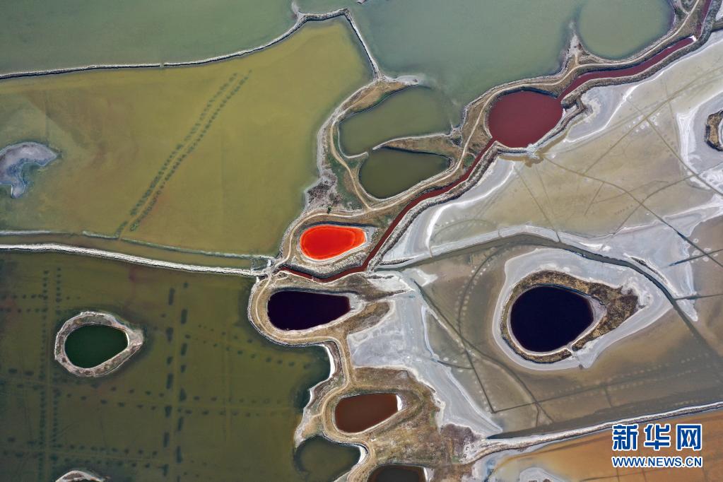 近日,隨著氣溫不斷升高,山西運城鹽湖呈現(xiàn)五彩斑斕的景象。