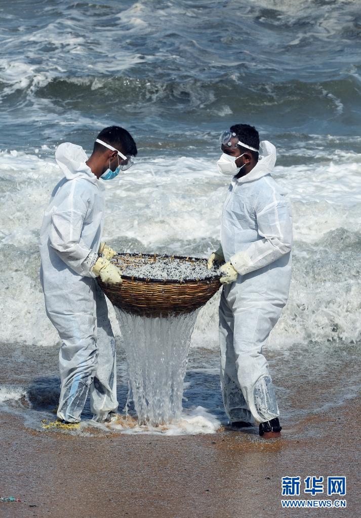 6月2日,工作人員在斯里蘭卡科倫坡一處沙灘清理貨船燃燒產生的廢物。
