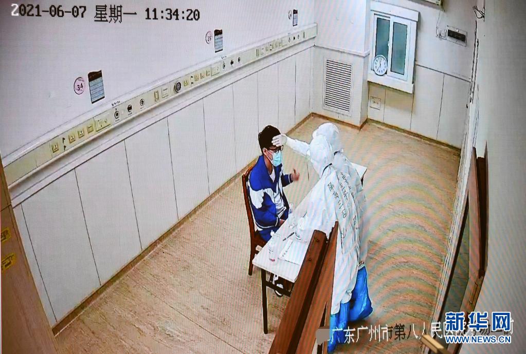 6月7日,廣東省國家教育考試指揮中心的監(jiān)控畫面顯示,上午語文考試結(jié)束后,廣州市八醫(yī)院嘉禾院區(qū)醫(yī)護(hù)人員對(duì)隔離病房考生的試卷、答題卡、稿紙等用品進(jìn)行消毒時(shí),用手背為考生腦門探熱。新華社記者 劉大偉 攝