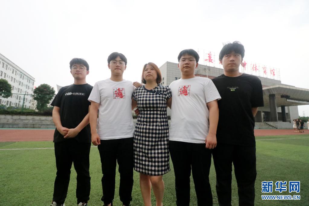 6月9日,在湖南省婁底市第四中學(xué),四胞胎兄弟李慶國(左一)、李慶泰(左二)、李慶民(右二)、李慶強(右一)在高考結(jié)束后和媽媽合影。