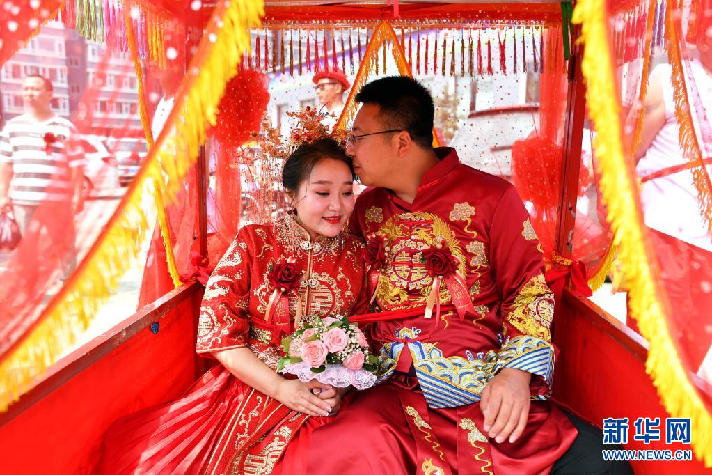 新郎周海云和新娘關(guān)美乘坐花轎前往婚禮儀式現(xiàn)場(chǎng)(6月15日攝)。