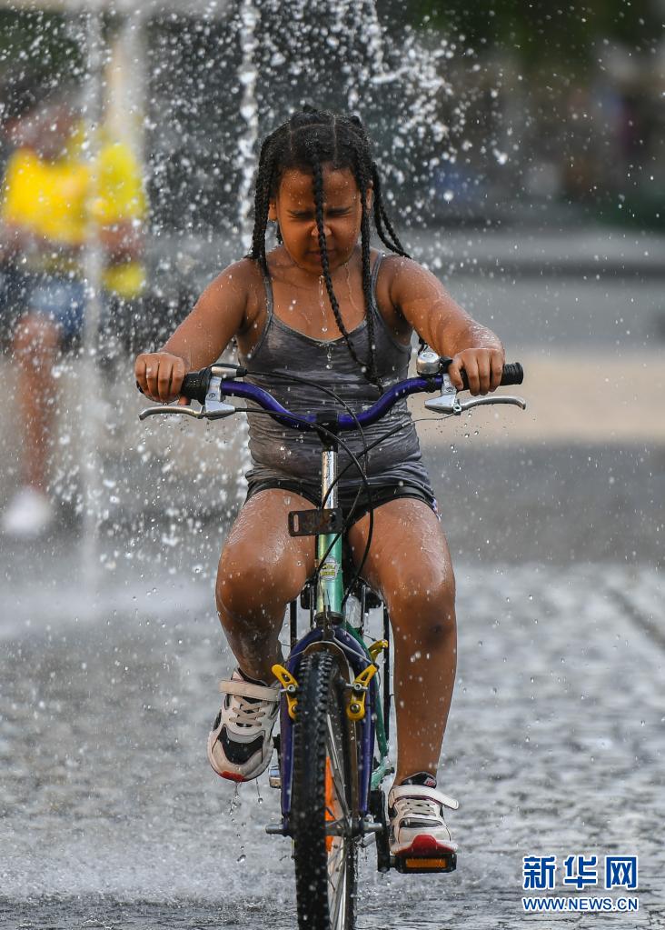 6月17日,在德國(guó)法蘭克福,一名小朋友騎車(chē)穿過(guò)噴泉納涼。