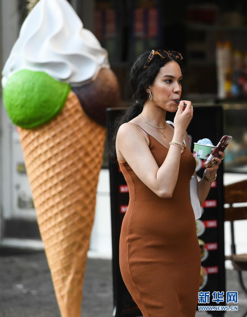 6月17日,在德國法蘭克福,一名女子手拿冰激凌從街頭走過。