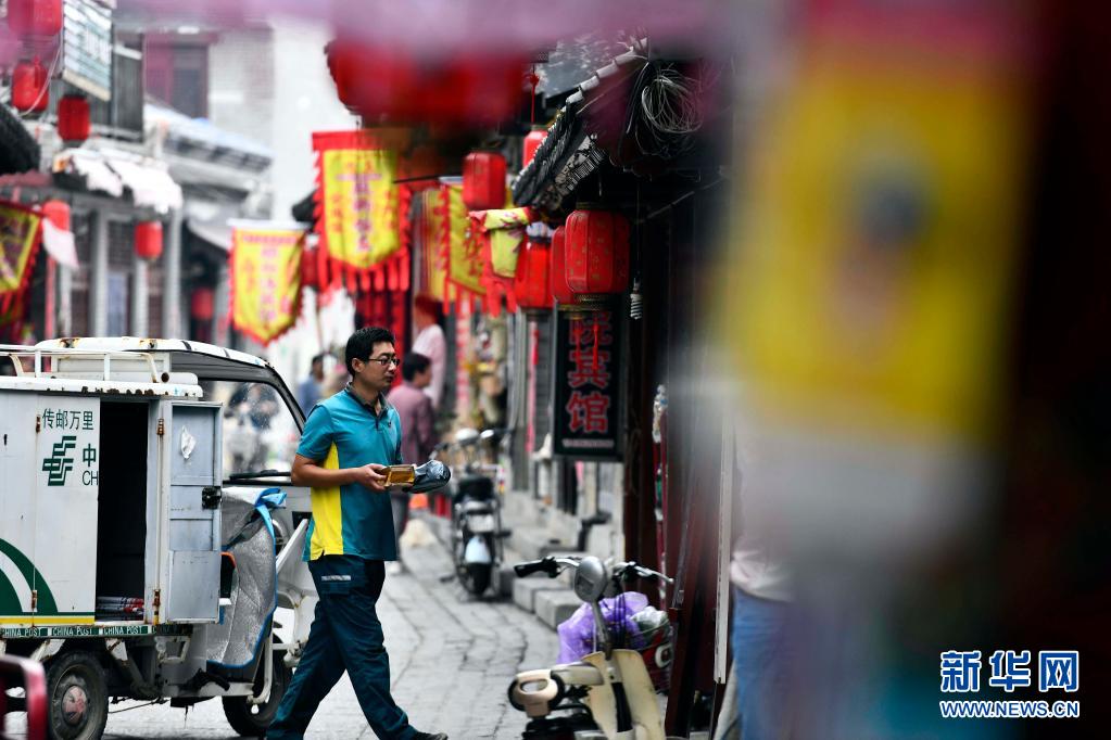 6月20日,在微山縣南陽(yáng)鎮(zhèn),郵遞員王少朋在投遞郵件。