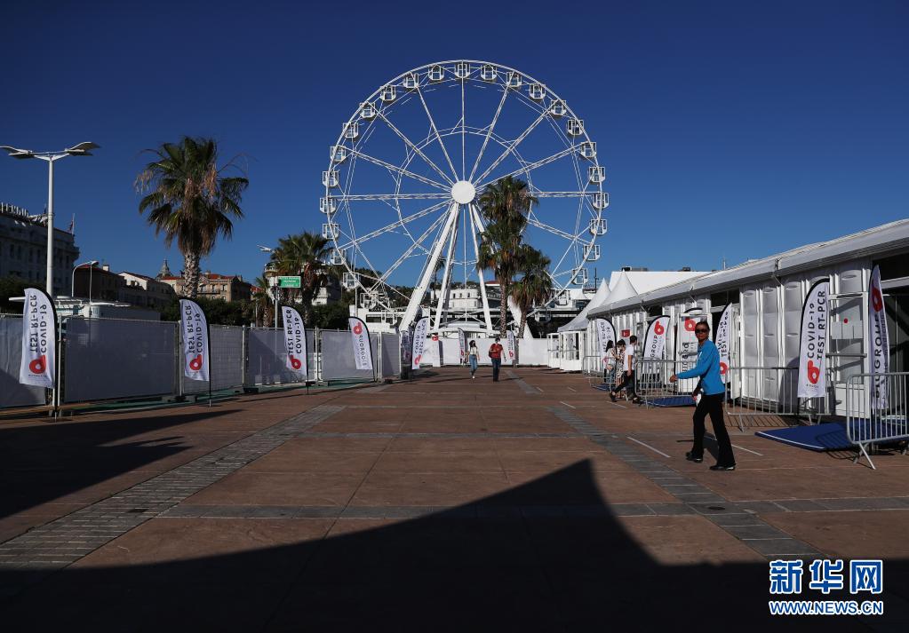 這是7月5日在法國戛納拍攝的為電影節(jié)注冊(cè)人員設(shè)立的新冠病毒檢測點(diǎn)。
