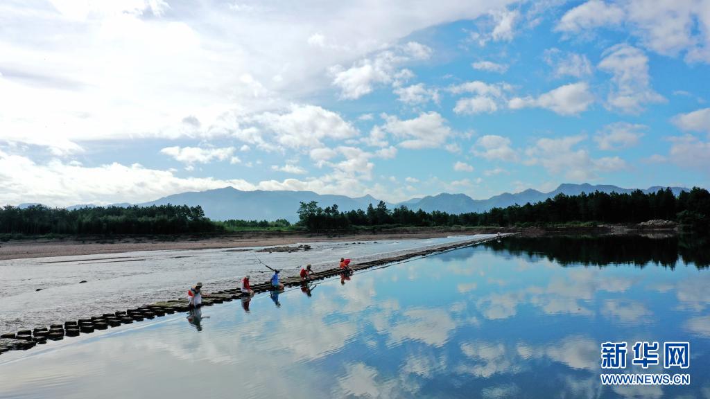 當(dāng)日,浙江省臺州市仙居縣永安溪流域水面如鏡,藍天、白云倒影水中,構(gòu)成一幅美麗的畫卷。新華社發(fā)(王華斌 攝)