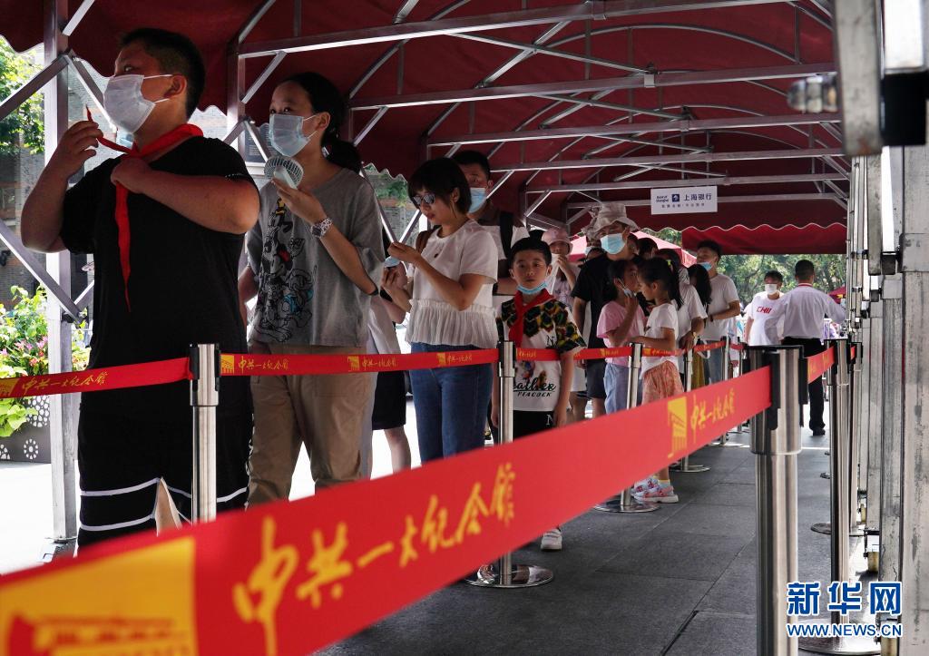 7月11日,觀眾在中共一大紀念館前的遮陽棚下排隊等待參觀。