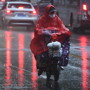 7月12日, 在北京市海淀區(qū)中關(guān)村街道科學院南路,市民在雨中騎行。