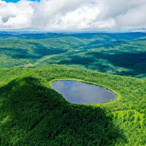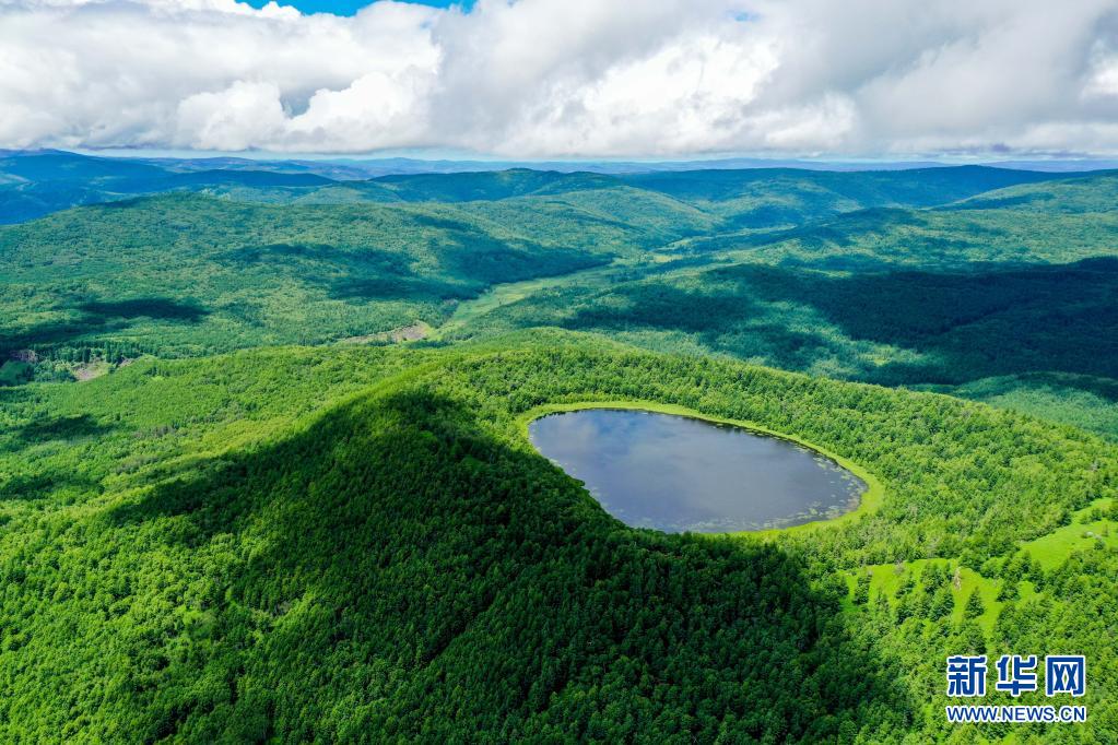 這是7月14日拍攝的阿爾山國(guó)家森林公園內(nèi)的天池(無(wú)人機(jī)照片)。