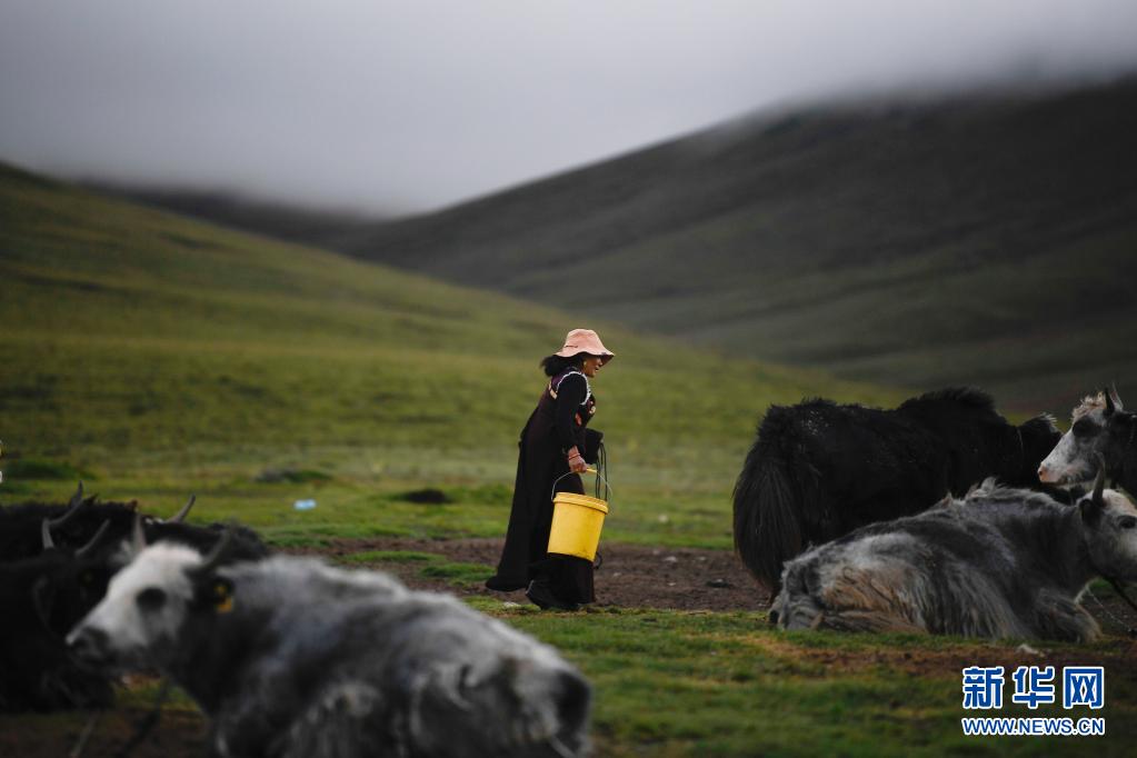8月3日,在瑪沁縣當(dāng)洛鄉(xiāng)貢龍村的夏季草場上,牧民準(zhǔn)備擠牛奶。