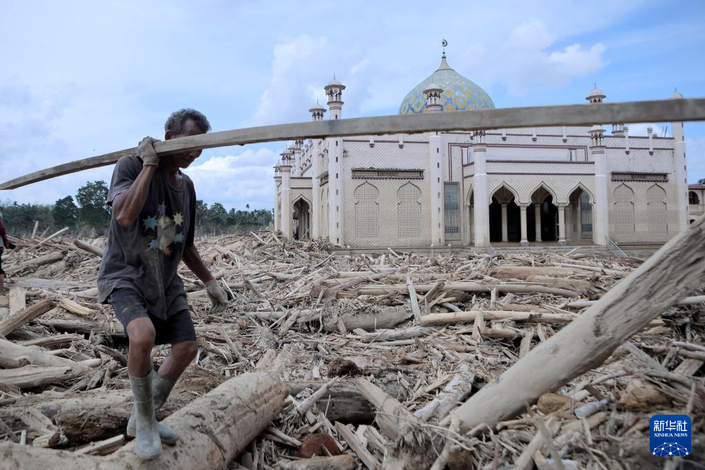 12月10日,在印度尼西亚亚齐省,村民在废墟中搬运木头。