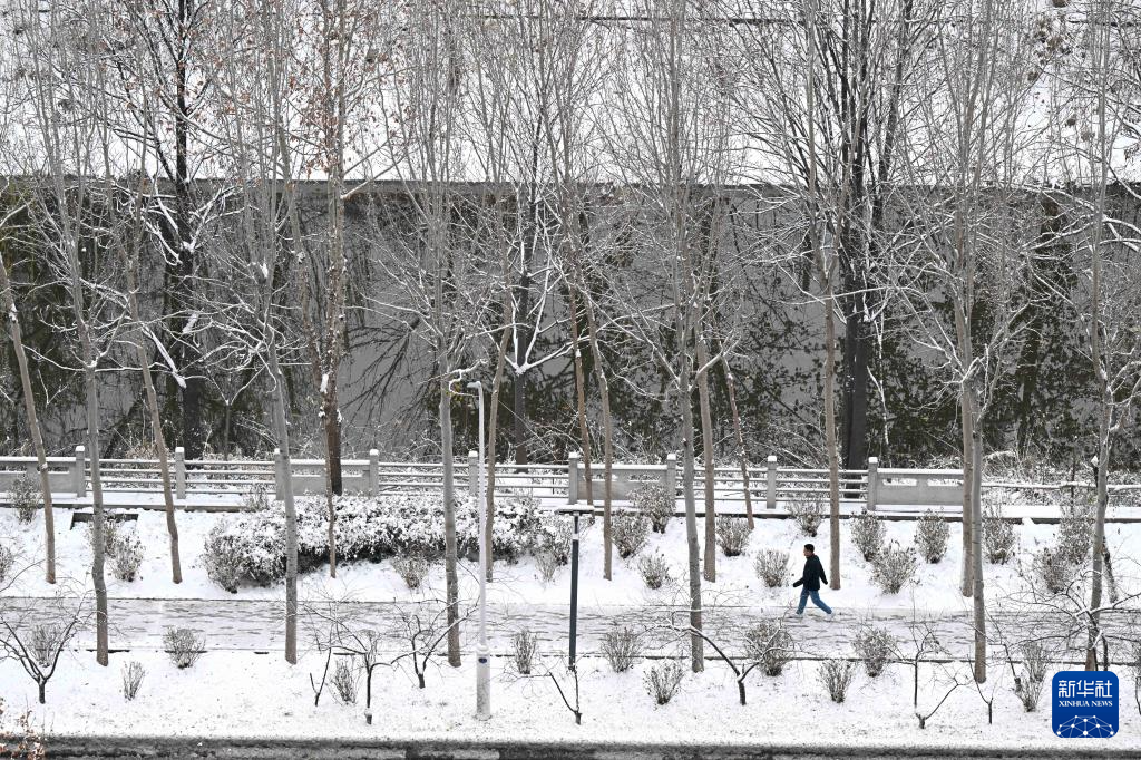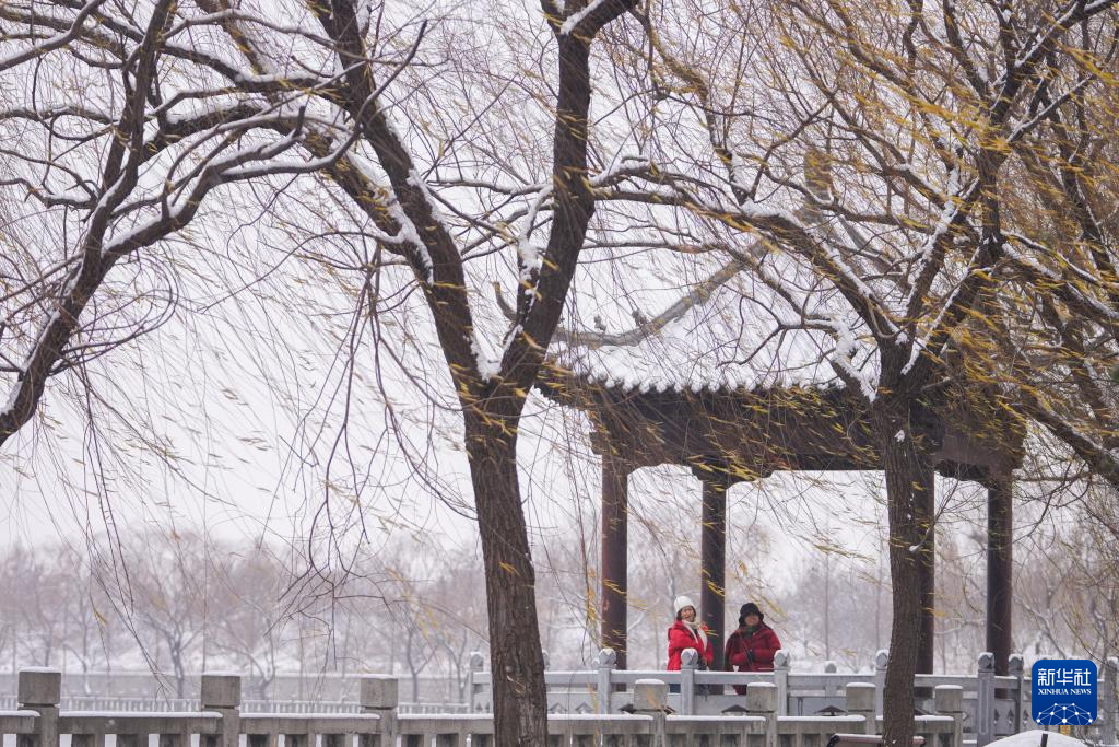 12月13日,市民在河北省石家庄市新华区一处公园的雪地里行走。