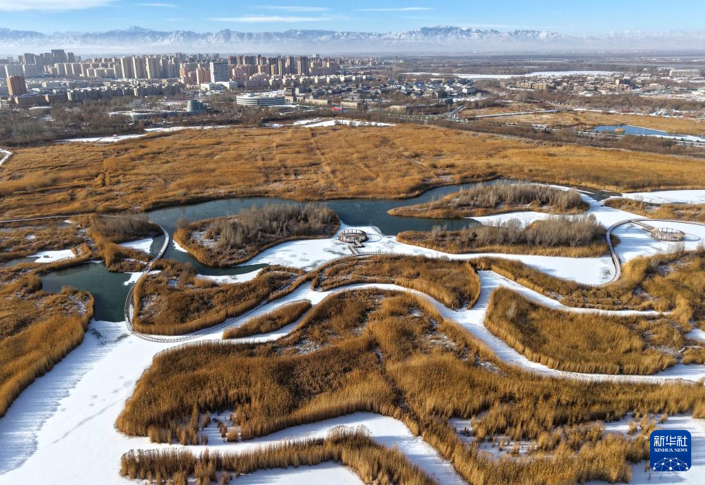12月13日在甘肃张掖国家湿地公园拍摄的雪后景色。