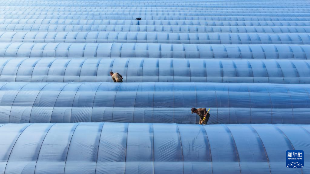 12月16日,在山东省东营市广饶县李鹊镇,农民在搭建拱棚(无人机照片)。