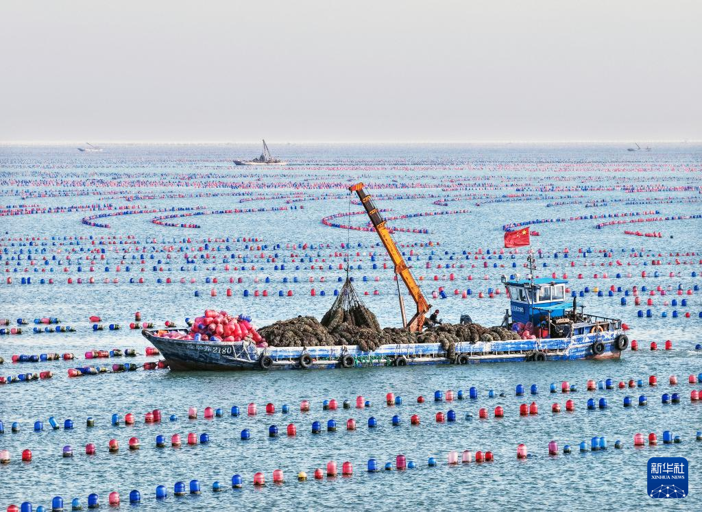 12月15日,渔民在江苏省连云港市海州湾渔场养殖区收获牡蛎(无人机照片)。