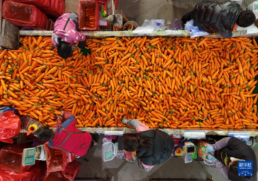 12月16日,河南省焦作市温县东张王庄村村民在分装胡萝卜(无人机照片)。