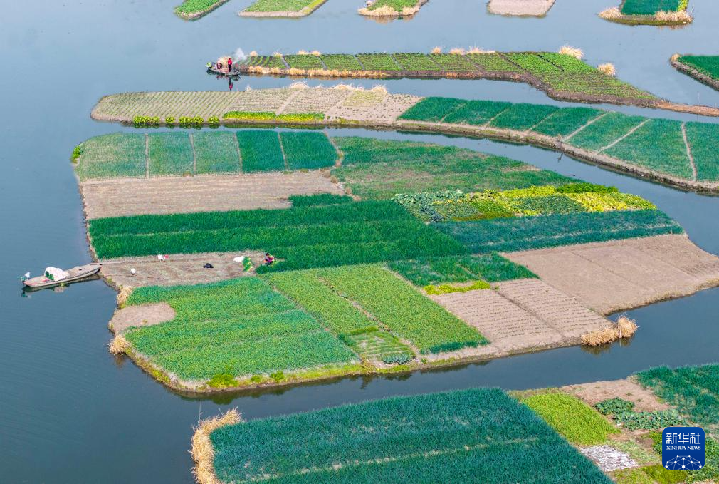 12月16日,农民在江苏省兴化市垛田街道收获香葱(无人机照片)。