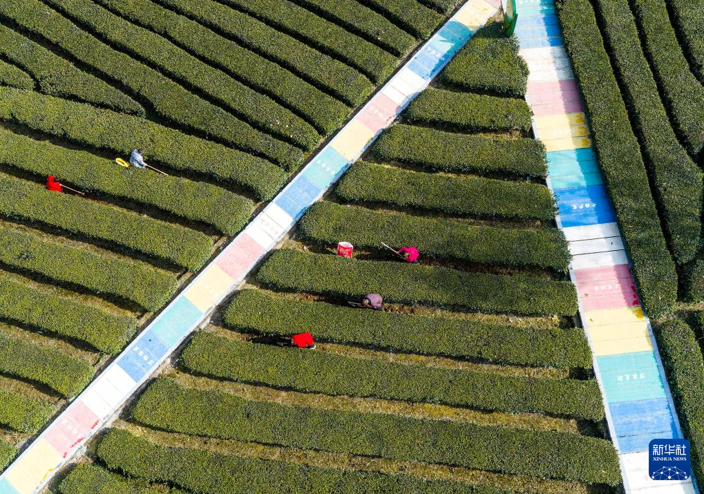 12月16日,湖北省秭归县茅坪镇花果园村村民对茶园进行翻耕深施有机肥(无人机照片)。