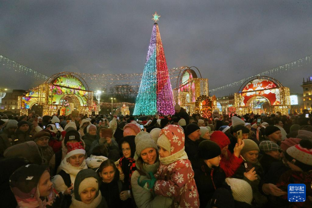 12月15日,在白俄罗斯明斯克,人们参加新年树亮灯仪式。