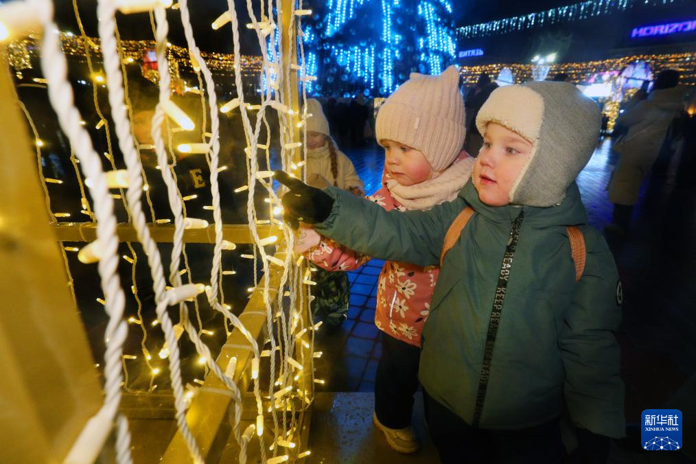 12月15日,在白俄罗斯明斯克,孩子们观看灯饰。