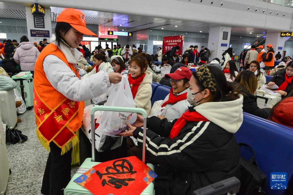 1月19日,在安徽阜阳西站候车大厅,志愿者在给大学生们送暖心餐。