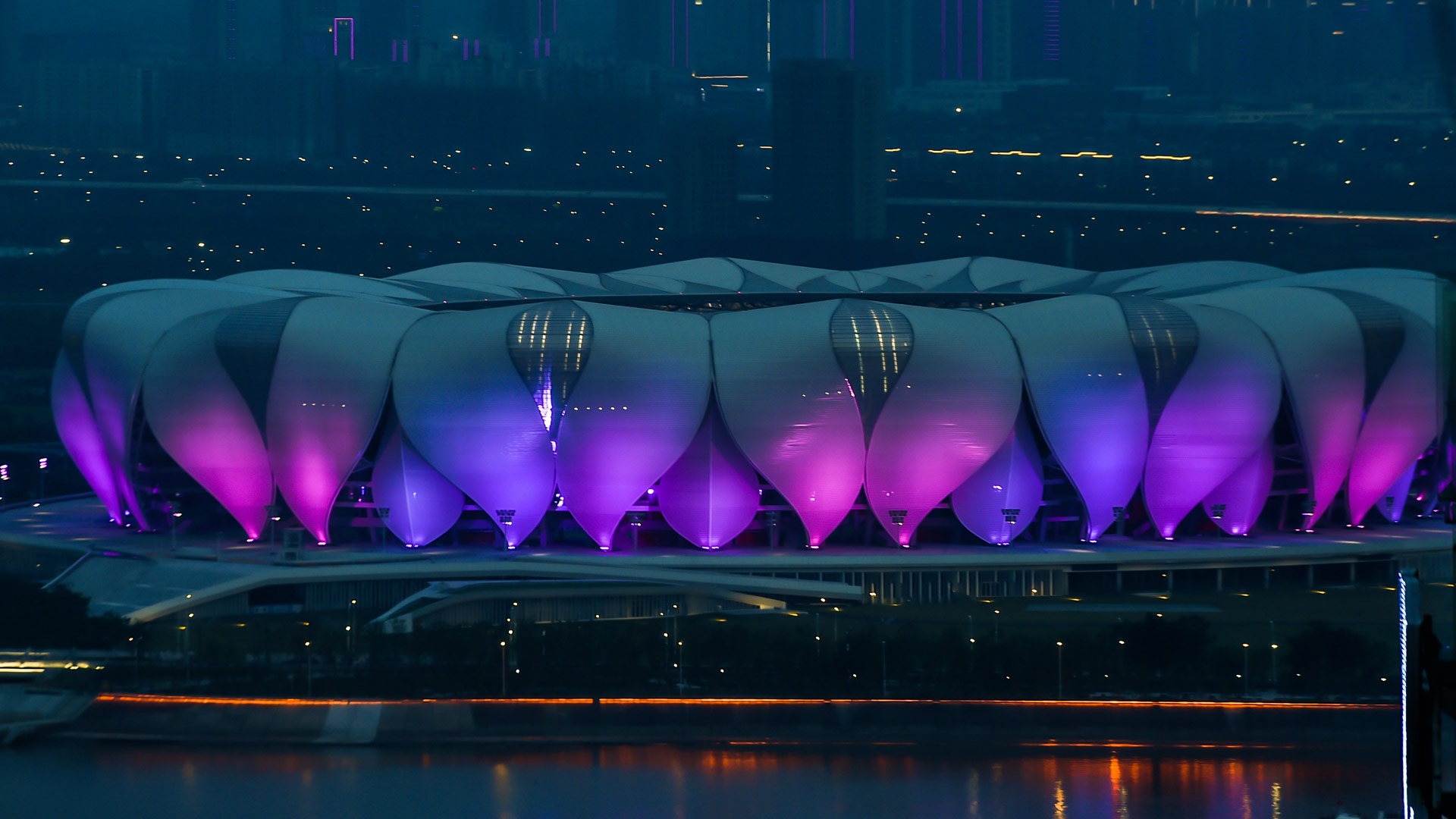 杭州奧體中心主體育場(chǎng)被彩燈點(diǎn)亮(8月31日攝)。新華社記者 徐昱 攝