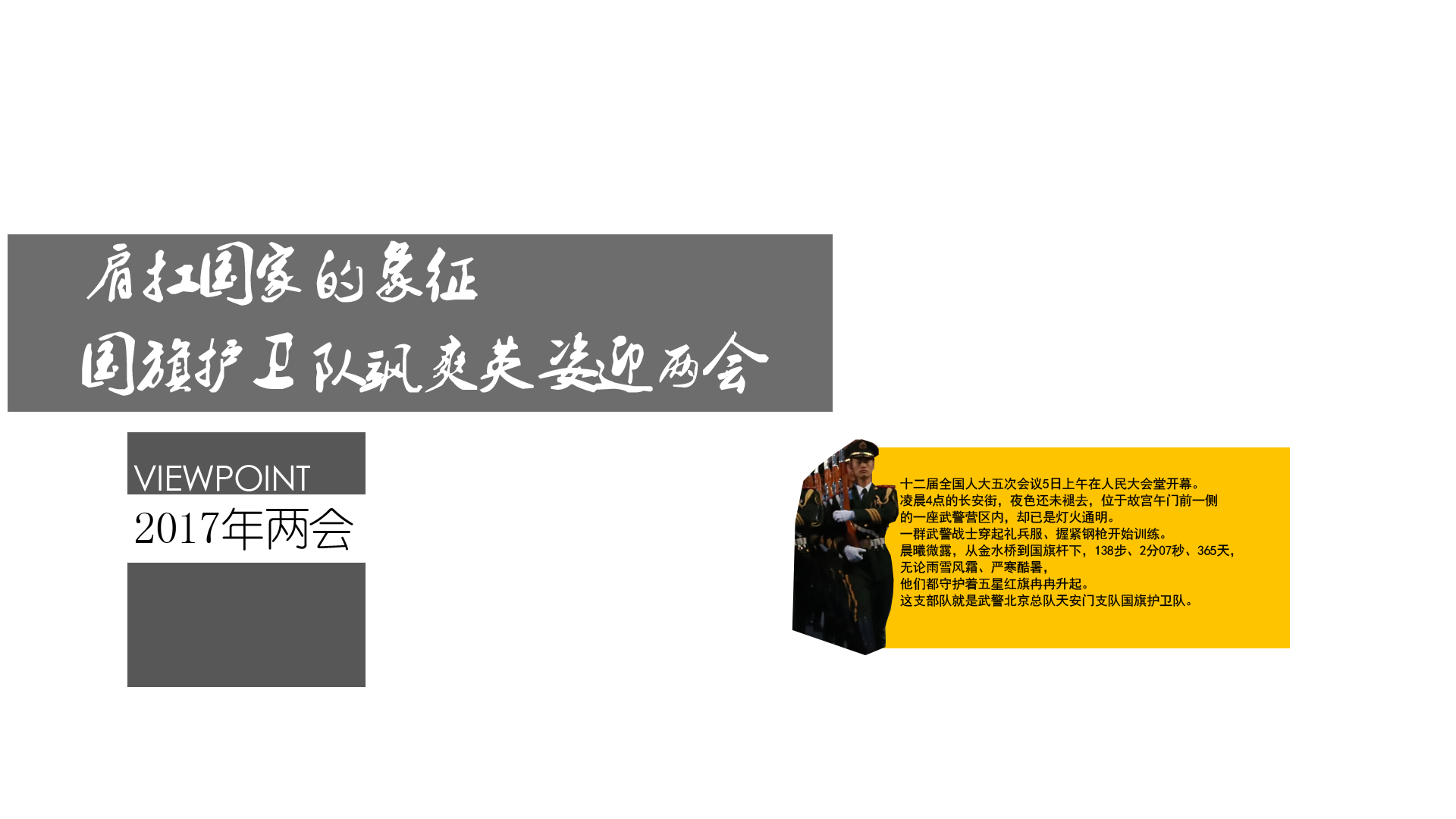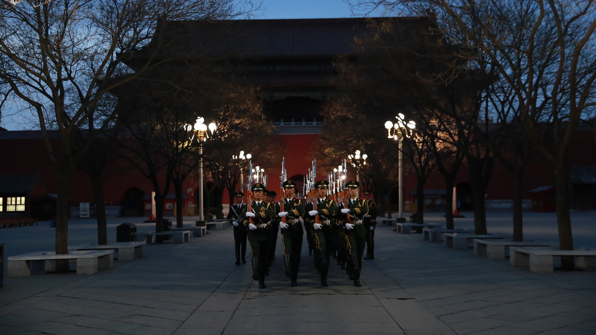 2017年3月5日,第十二屆全國人民代表大會第五次會議在人民大會堂開幕。凌晨4點的長安街,夜色還未褪去,位于故宮午門前一側(cè)的一座武警營區(qū)內(nèi),卻已是燈火通明。一群武警戰(zhàn)士穿起禮兵服、握緊鋼槍開始訓(xùn)練。晨曦微露,從金水橋到國旗桿下,138步、2分07秒、365天,無論雨雪風(fēng)霜、嚴(yán)寒酷暑,他們都守護著五星紅旗冉冉升起。這支部隊就是武警北京總隊天安門支隊國旗護衛(wèi)隊。