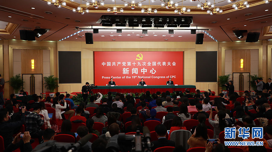 10月23日,十九大新聞中心舉辦記者招待會,邀請中央財經(jīng)領(lǐng)導小組辦公室副主任楊偉民,環(huán)境保護部黨組書記、部長李干杰介紹踐行綠色發(fā)展理念,建設(shè)美麗中國有關(guān)情況,并回答記者提問。圖為記者招待會現(xiàn)場。新華網(wǎng) 郝廣鵬攝