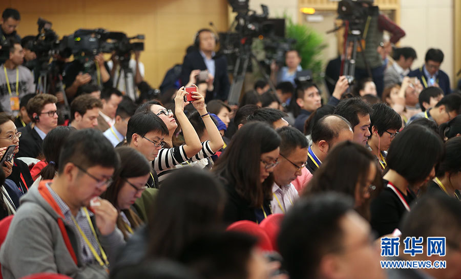 10月23日,十九大新聞中心舉辦記者招待會(huì),邀請(qǐng)中央財(cái)經(jīng)領(lǐng)導(dǎo)小組辦公室副主任楊偉民,環(huán)境保護(hù)部黨組書記、部長李干杰介紹踐行綠色發(fā)展理念,建設(shè)美麗中國有關(guān)情況,并回答記者提問。圖為現(xiàn)場(chǎng)記者。新華網(wǎng) 郝廣鵬攝