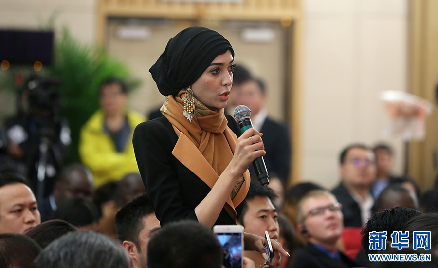 10月26日上午10:00,中國共產(chǎn)黨第十九次全國代表大會新聞發(fā)言人在梅地亞賓館二層新聞發(fā)布廳召開專題新聞發(fā)布會,請有關(guān)方面負(fù)責(zé)人解讀十九大報告,并回答記者關(guān)心的問題。圖為迪拜中阿衛(wèi)視記者提問。新華網(wǎng) 王成云 攝