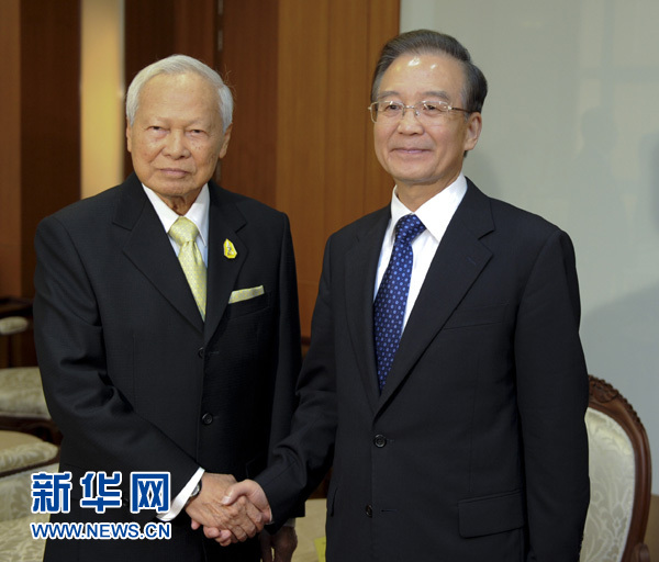 ??? 11月21日,國(guó)務(wù)院總理溫家寶在曼谷會(huì)見(jiàn)泰國(guó)樞密院主席炳·廷素拉暖上將。 新華社記者 張鐸 攝