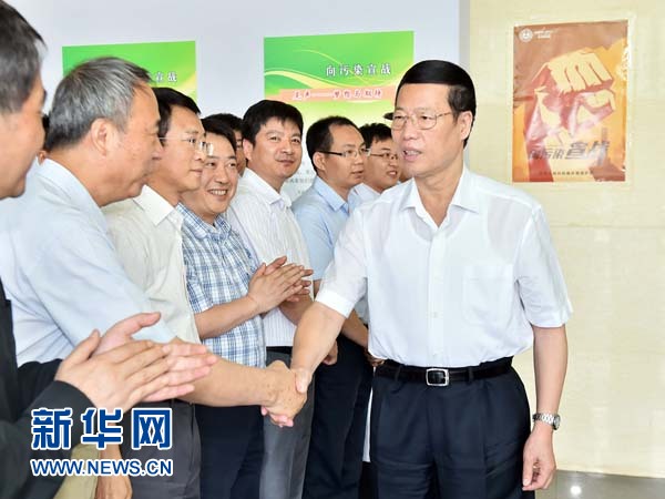 ??? 6月5日,中共中央政治局常委、國務(wù)院副總理張高麗到中國環(huán)境科學(xué)研究院和中國環(huán)境監(jiān)測(cè)總站調(diào)研。這是張高麗與科技工作者親切握手交談。新華社記者 李濤 攝