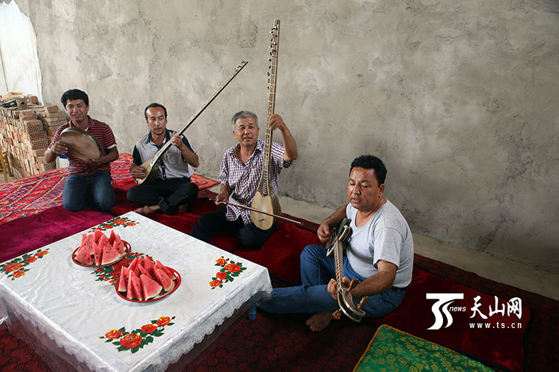 7月10日,蘇來曼·阿不都(右二)與村里的民間藝人一起奏唱《十二木卡姆》。新疆經(jīng)濟報記者 李瑞 攝