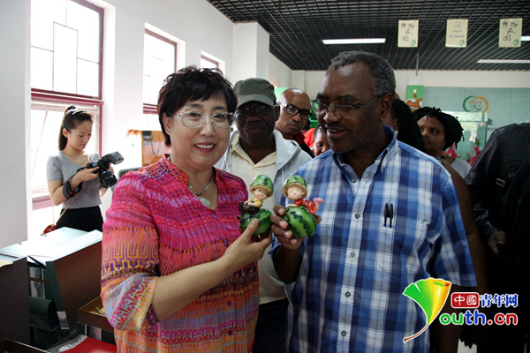 馮樂平(左一)介紹西瓜工藝品。本人供圖