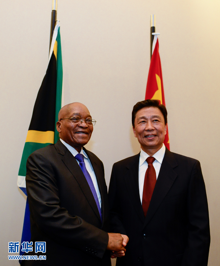 11月22日,南非共和國總統(tǒng)、非洲人國民大會主席雅各布·祖馬(左)在開普敦會見應(yīng)邀訪問的中國國家副主席李源潮。 新華社記者翟健嵐攝