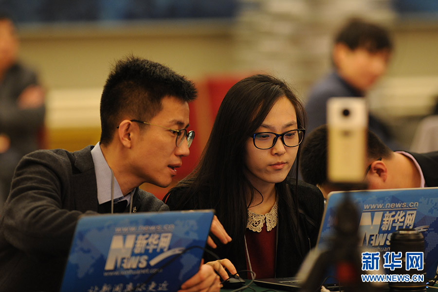3月16日上午,國務院總理李克強在人民大會堂三樓金色大廳會見采訪十二屆全國人大四次會議的中外記者并回答記者提出的問題。圖為新華網(wǎng)記者準備總理記者會直播。新華網(wǎng)/中國政府網(wǎng) 陳杰攝